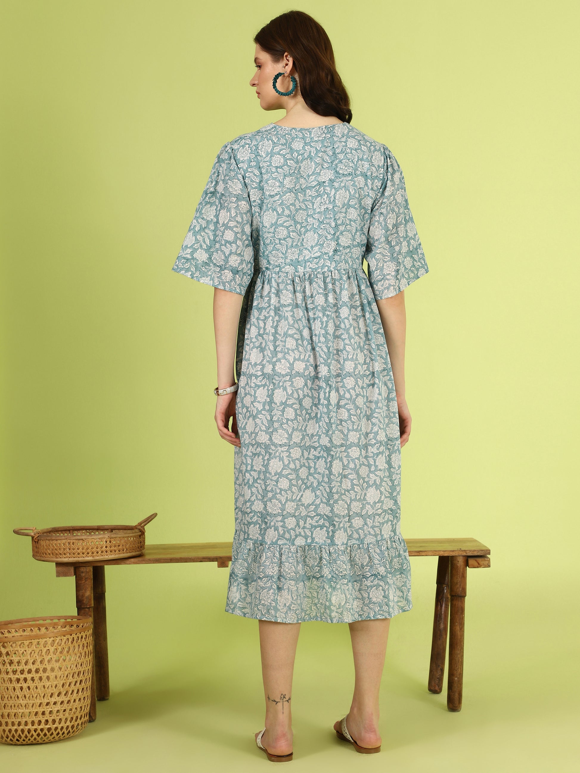 Fabric : Crafted from breathable handblock cotton, the Aarvi Dress features delicate floral motifs in soothing sky-blue tones. Each piece is hand-printed using traditional wooden blocks and natural dyes, giving it a soft texture and artisanal depth. The fabric drapes gracefully while staying cool and comfortable through long days.