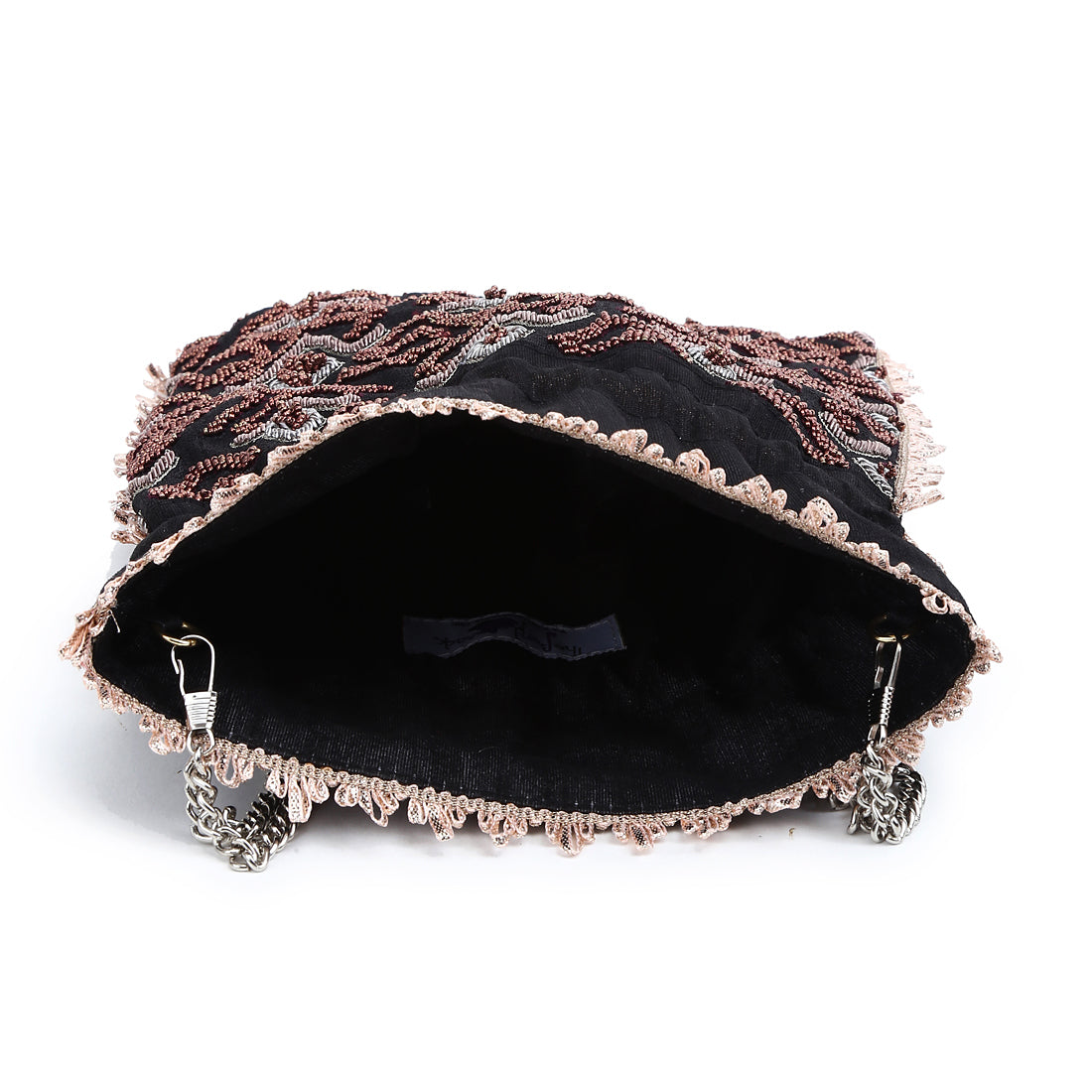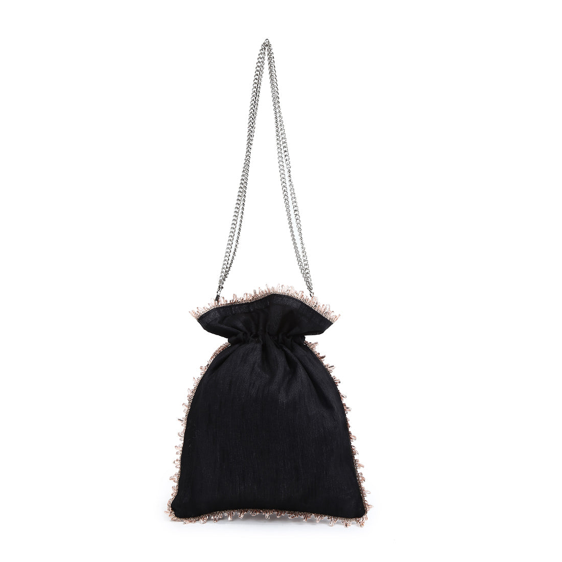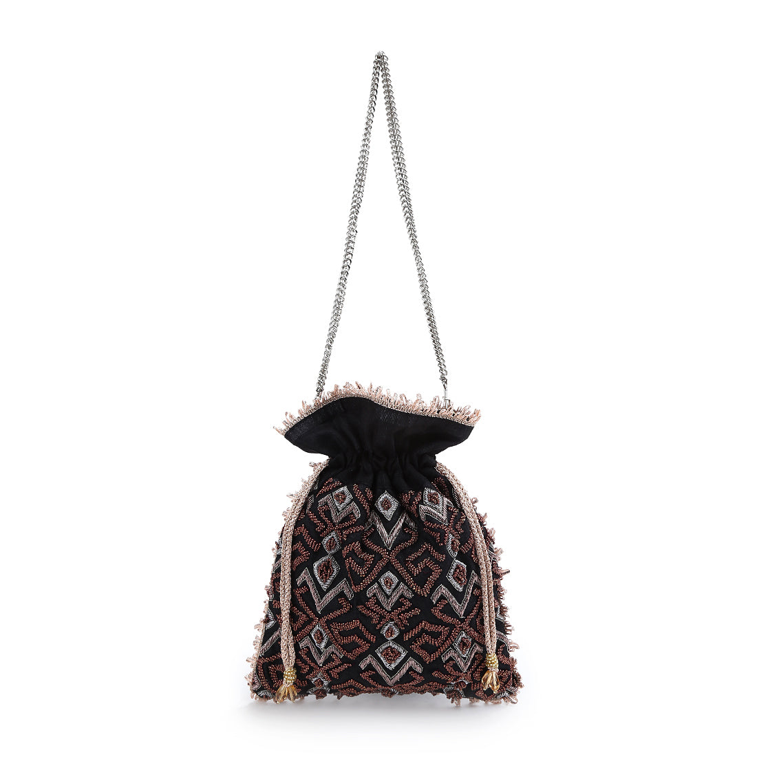 Gorgeous hand embroidery potli, that comes with a detachable sling chain. Carry it with the chain or the drawstring.