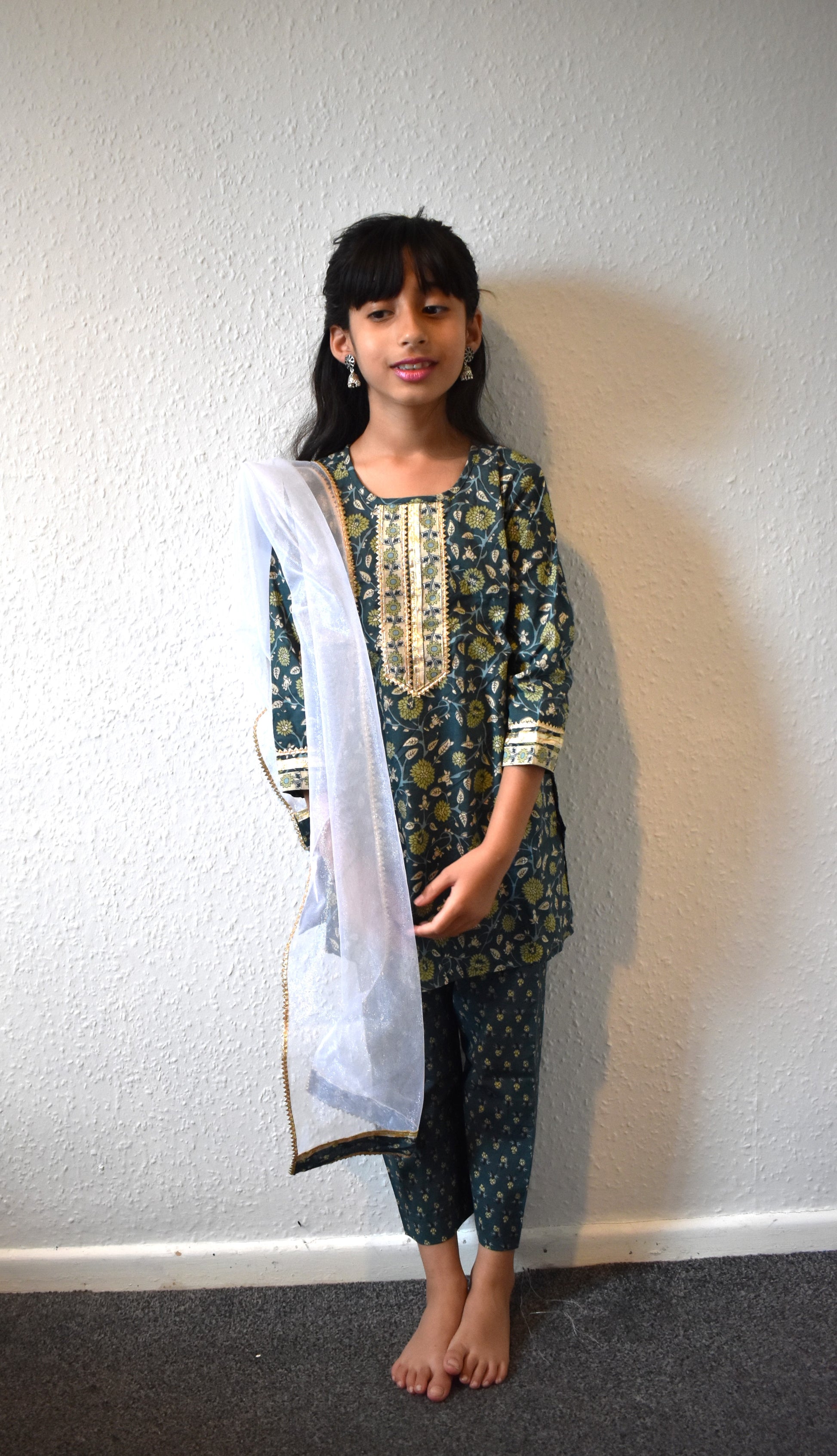 Be it festivities or a family gathering, dress your little girl in this exquisite, ethnic kurta payjama set. The set of 3 pieces, consisting of a green floral print kurta with embellishments all over. Comes with a matching green payjama and with a complementing dupatta. From Rakhi to Diwali, she will have an elegant look that will make her stand out.