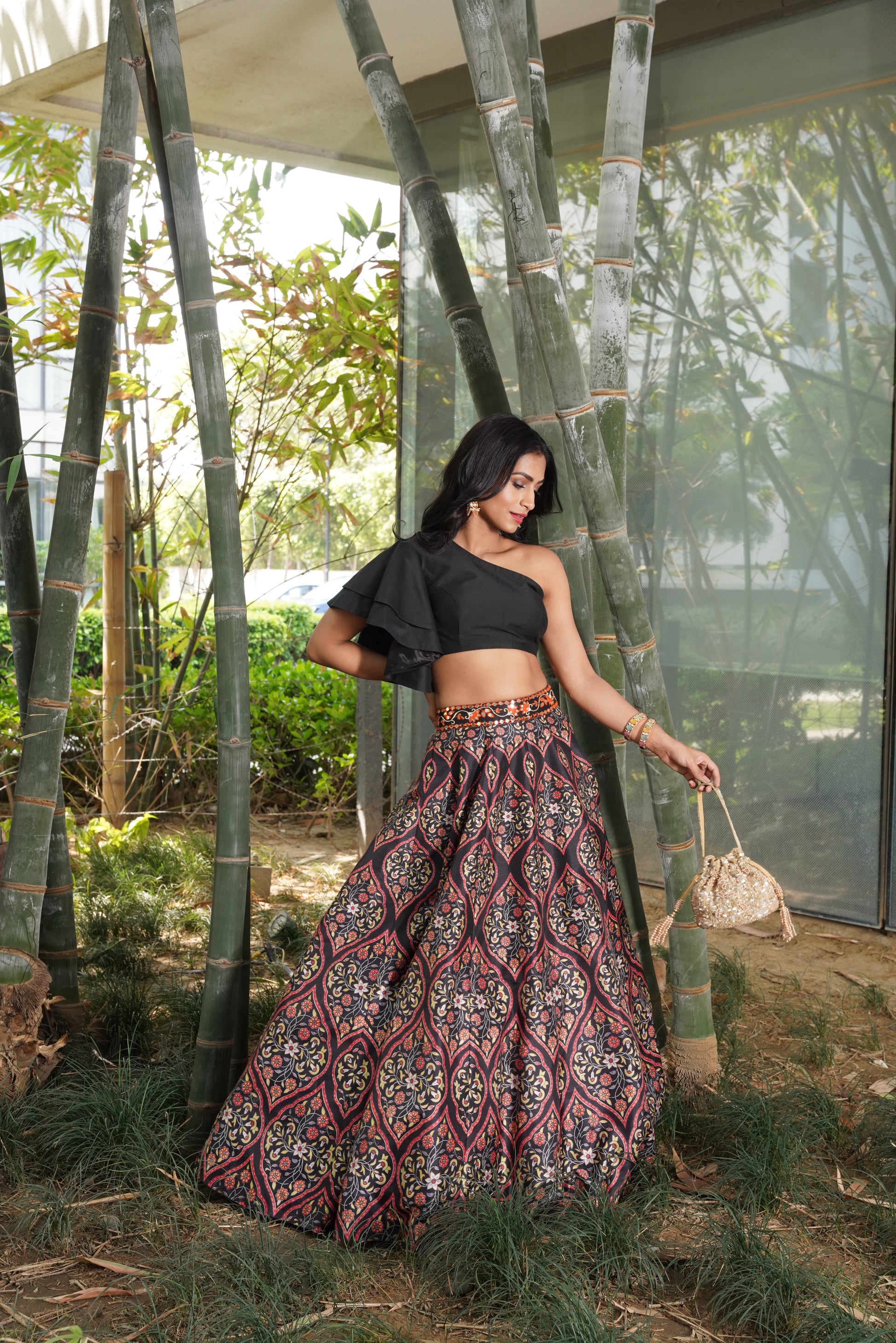 - Description-Black Dupion Multi Colored Printed Lehenga with Embroidered Belt paired with One Shoulder Cotton Silk Ruffle Blouse.