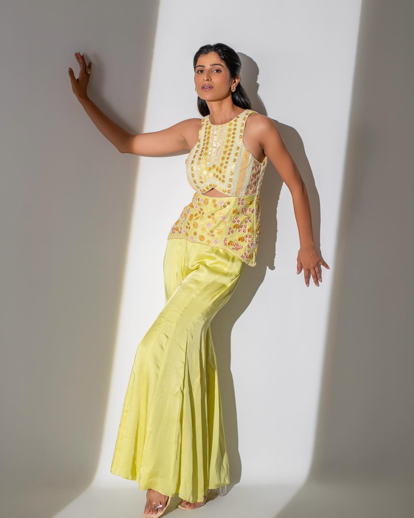 This captivating collection unfolds in soft lemon-toned hues, showcasing a meticulously designed statement blouse paired with gracefully voluminous sharara trousers. Delicate embroidered accents and refined ornamentation infuse the ensemble with an understated romantic sensibility and timeless allure.