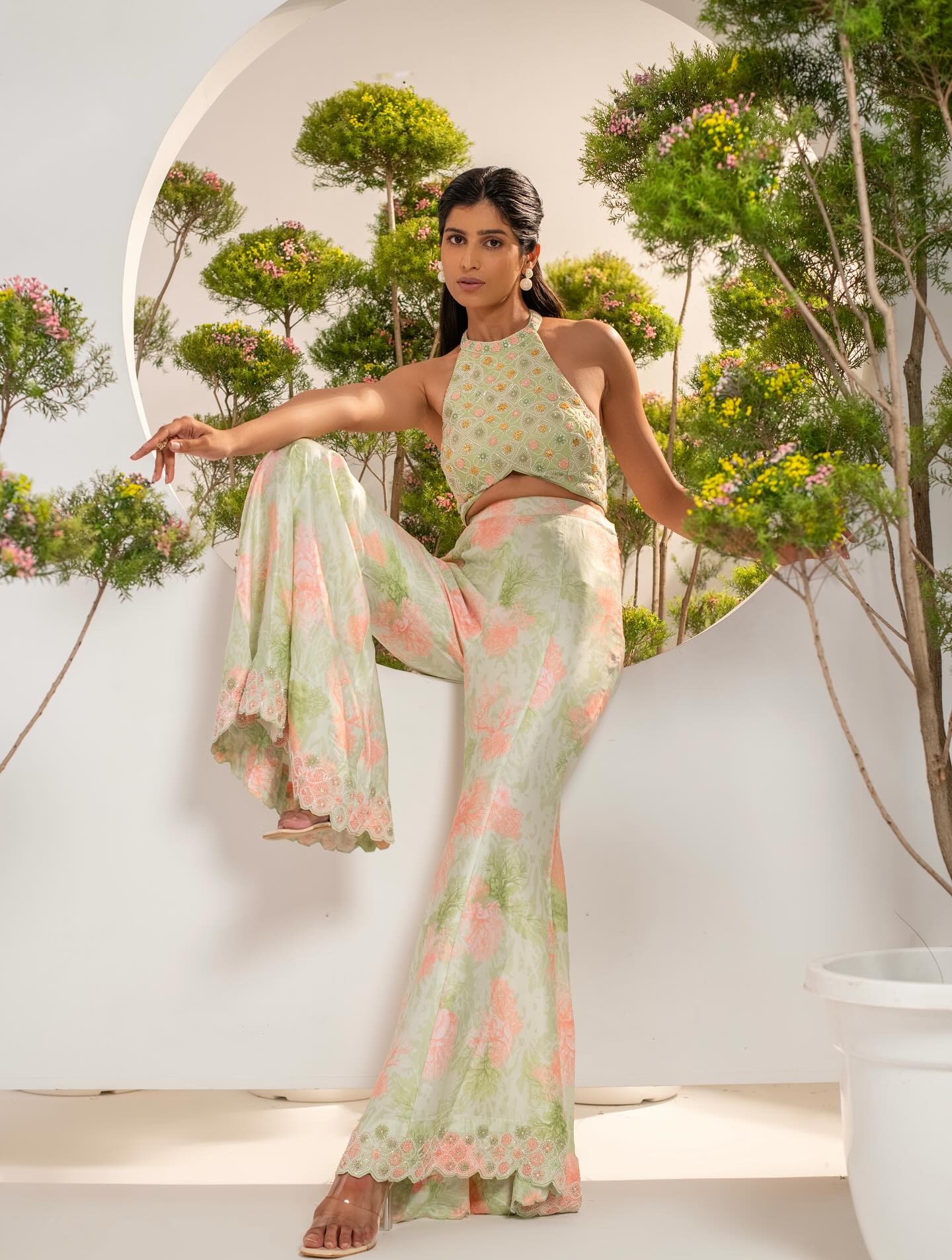 This distinguished two-piece collection presents a halter-neck blouse embellished with elaborate hand-stitched detailing, refined metallic accents, and exquisite threadwork. It pairs beautifully with flowing bell-bottom sharara trousers finished with ornamental scalloped embroidered edges. Together, they create an elegant ensemble that celebrates artisanal craftsmanship and contemporary silhouettes.