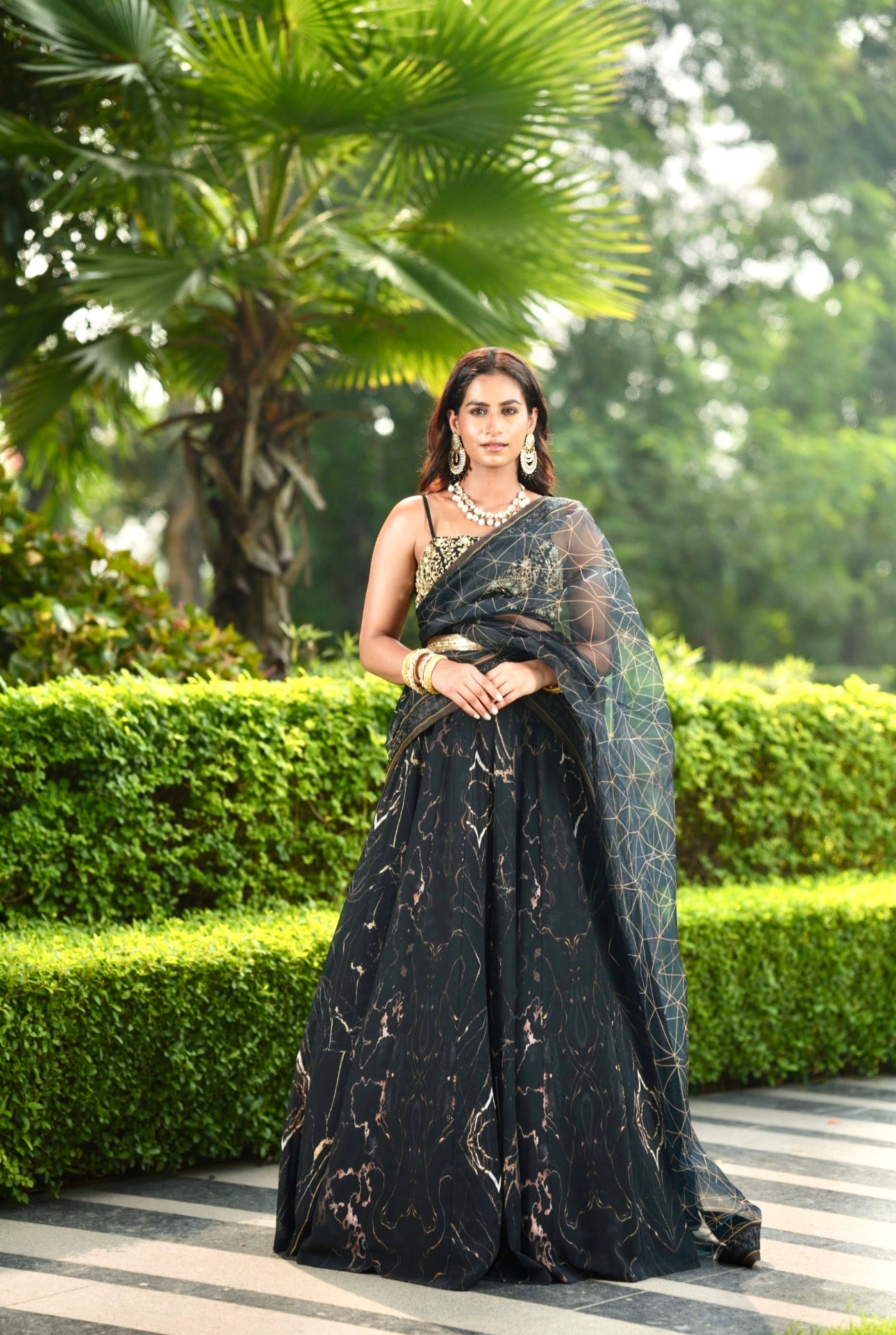Experience the luxurious elegance of our Meesha Lehenga Set featuring a hand-embroidered chiffon blouse, a printed georgette lehenga, and a gorgeous printed organza dupatta. Complete with a hand-embroidered belt and a beautiful array of bead, mirror, nakshi, zari, resham, and sequin work, this set exudes sophistication and exclusivity. The chiffon blouse, georgette lehenga, and organza dupatta come in a sleek and refined black color, making it a timeless addition to your wardrobe.