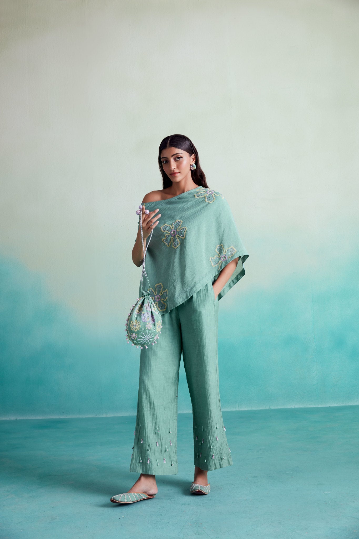 Complementing the top, the mint straight-cut trousers feature handmade hangings at the bottom, adding a touch of uniqueness to your overall look.
