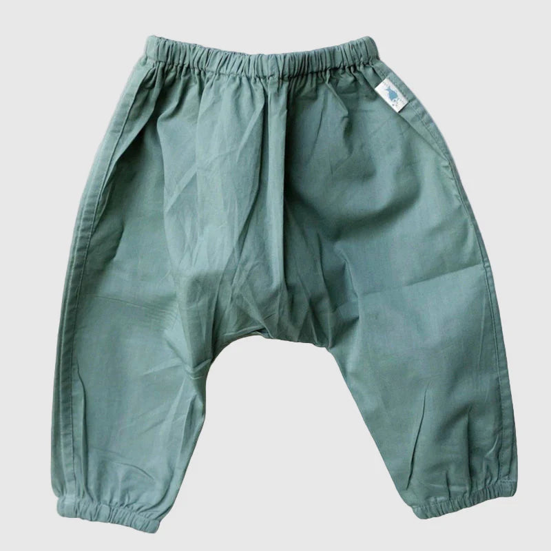 1 x pants: 100% organic cotton dyed with azo-free colours. Elasticated waistband and bottom hem. Sizes 2 years and above have side pockets for little treasures and adjustable waist strings for convenient wear.