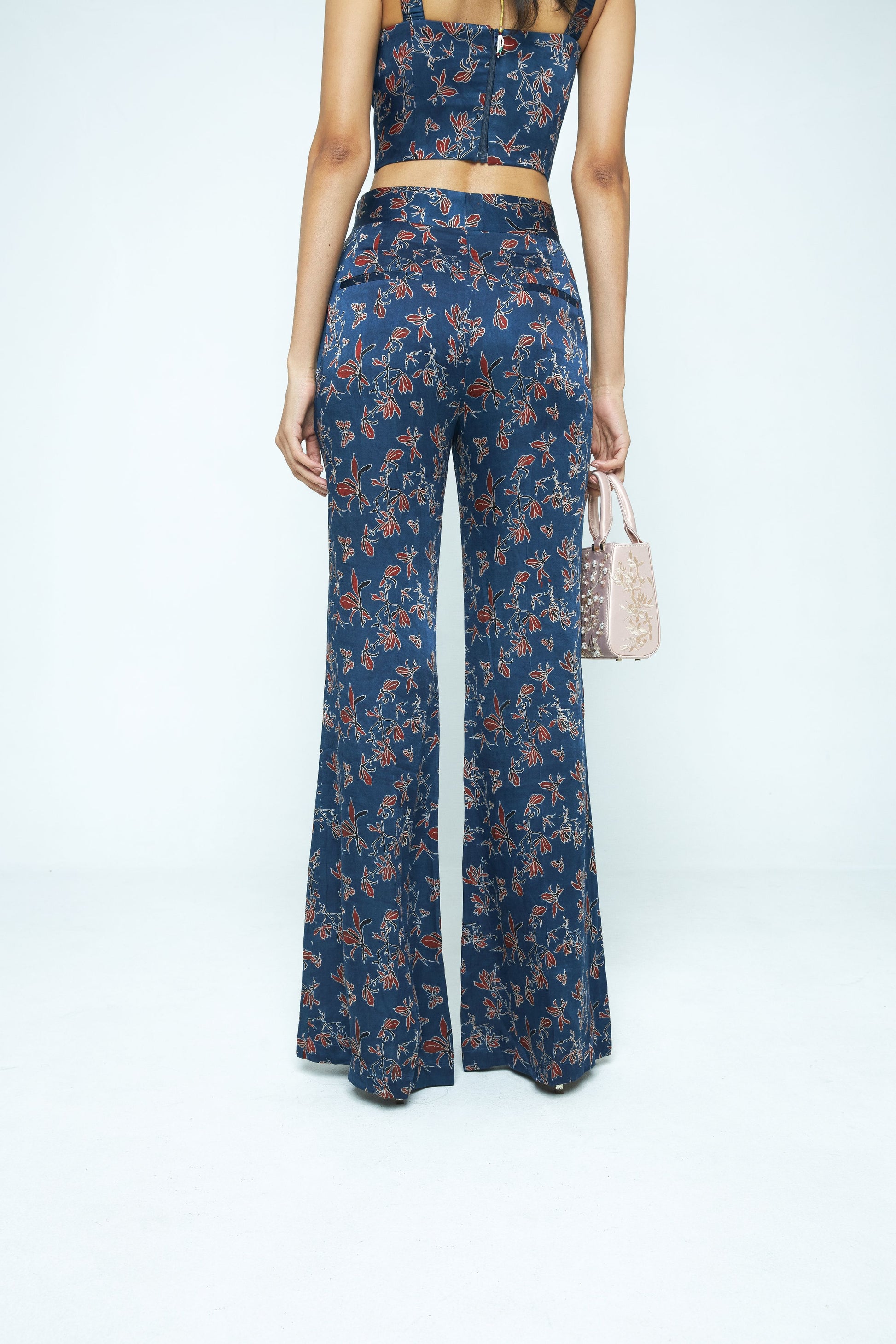 Description: Full-length flared pants in modal featuring the Fluttergarden print. Designed with a smooth mid-rise waistband and a soft flare through the leg, they create an elongated, flattering silhouette — elevated yet easy.