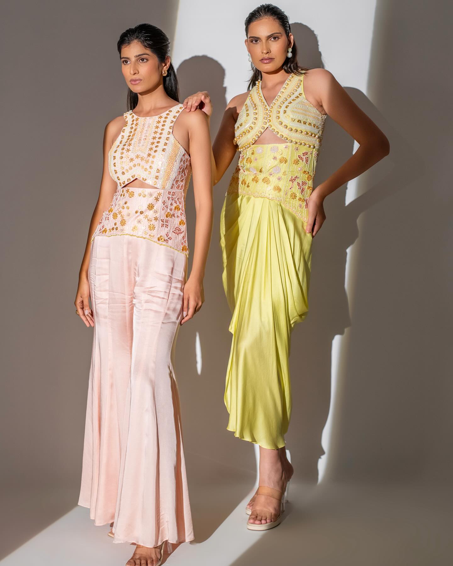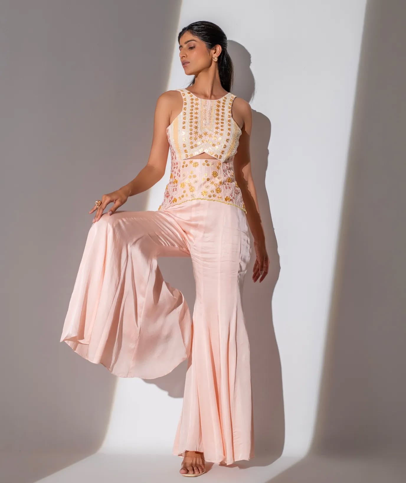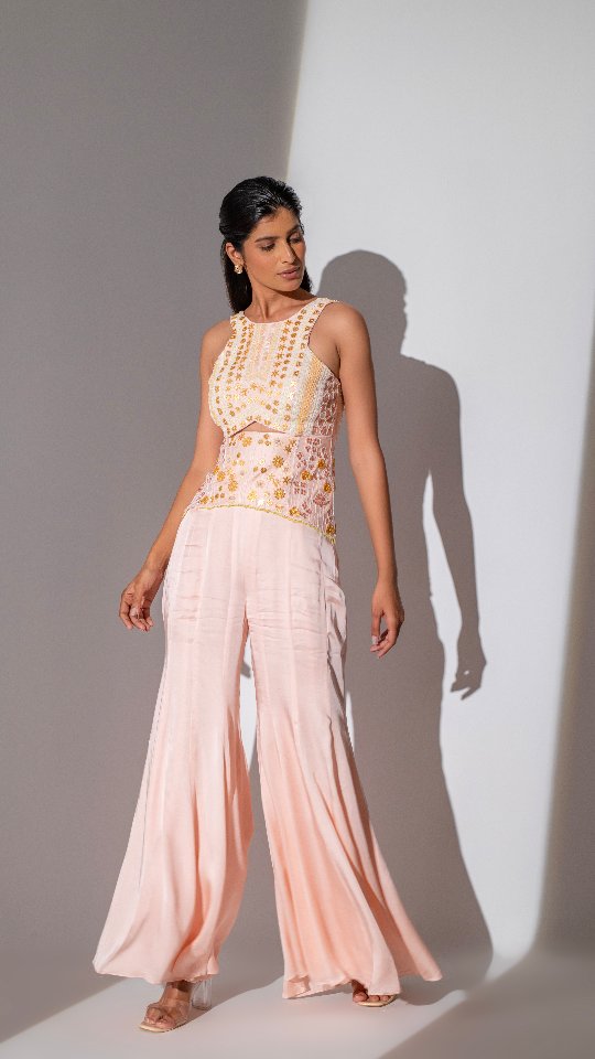 This enchanting collection unfolds in soft powder-pink tones, showcasing a meticulously designed statement blouse paired with elegantly voluminous sharara trousers. Delicate embroidered accents and refined ornamentation infuse the ensemble with an understated romantic sensibility and timeless grace.