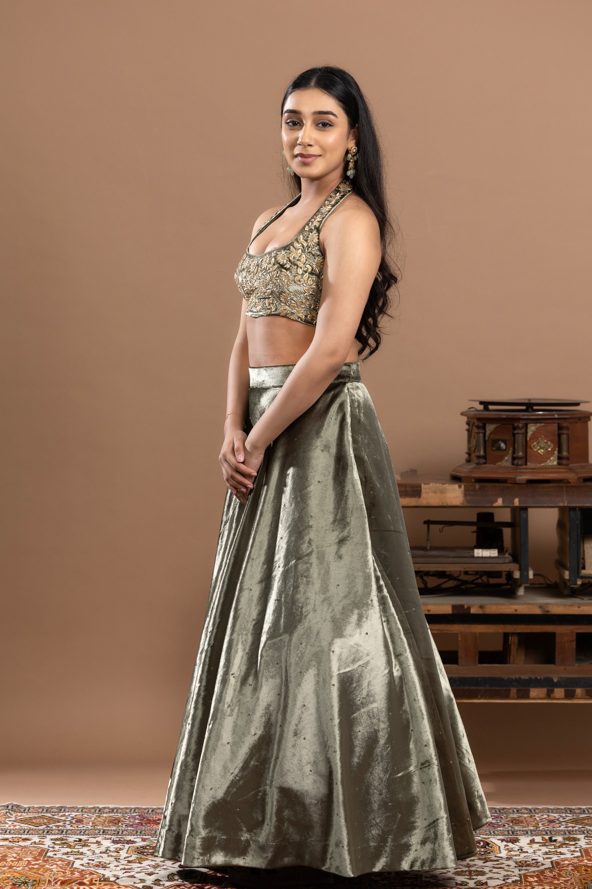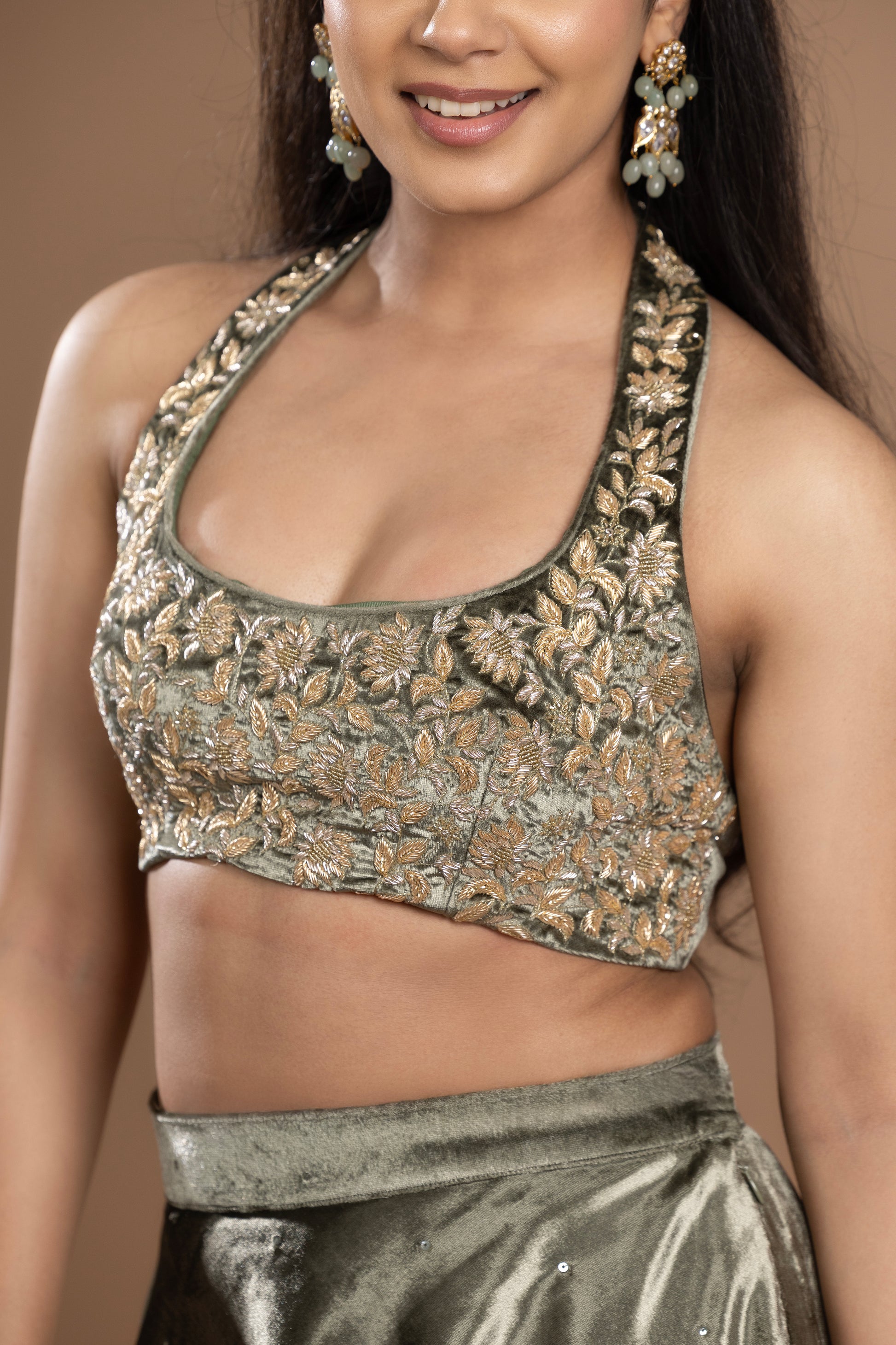 Sage green ankle-length lehenga with all-over sequin splatter, paired with a halter-neck blouse featuring ivory & golden zardozi, sequin, and cutdana work. Includes a detachable full-sleeve arm jacket with no shoulder coverage