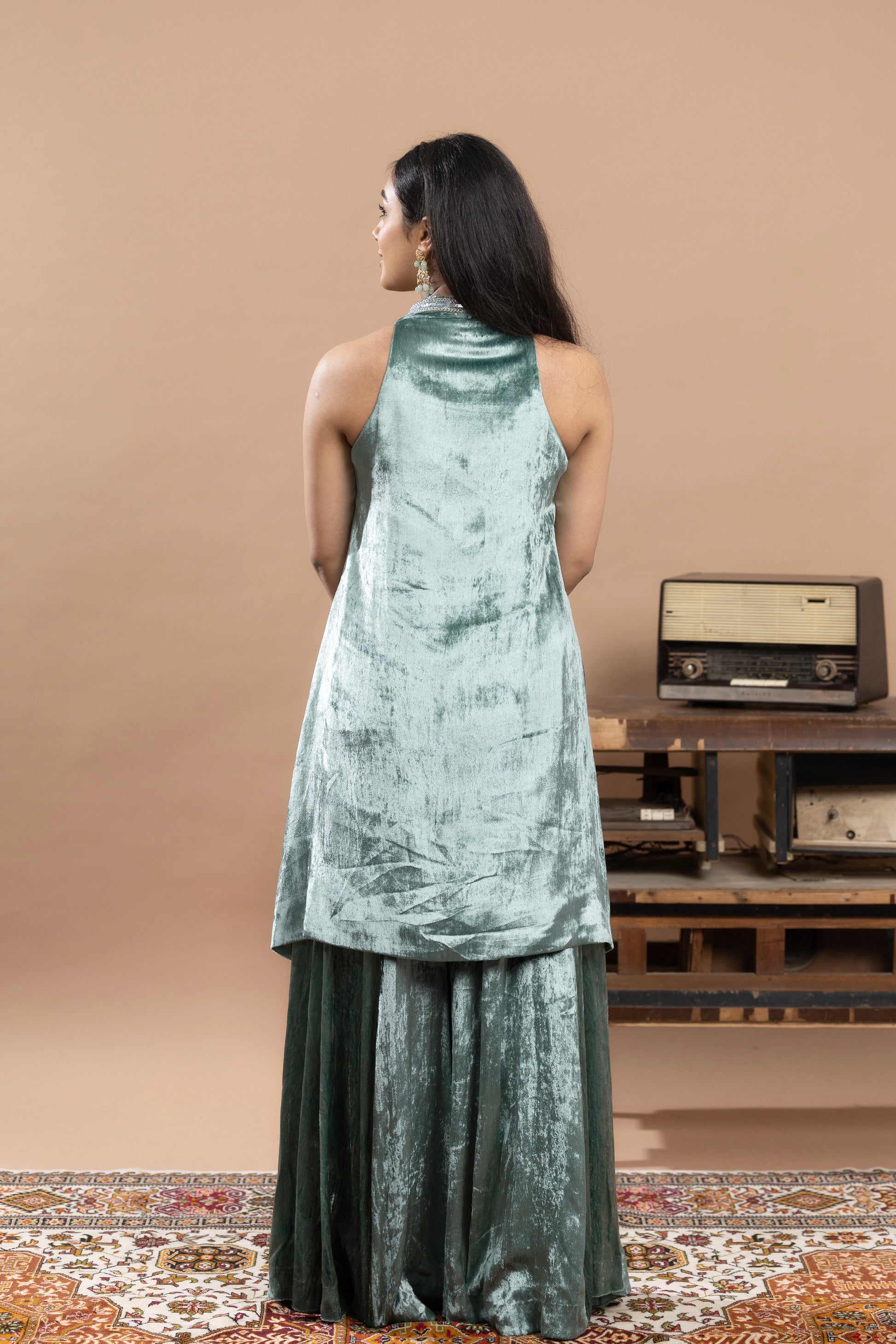 Heavy flared gharara paired with a fitted short kurta, both featuring intricate sequin work and heavy zardozi detailing at the hem