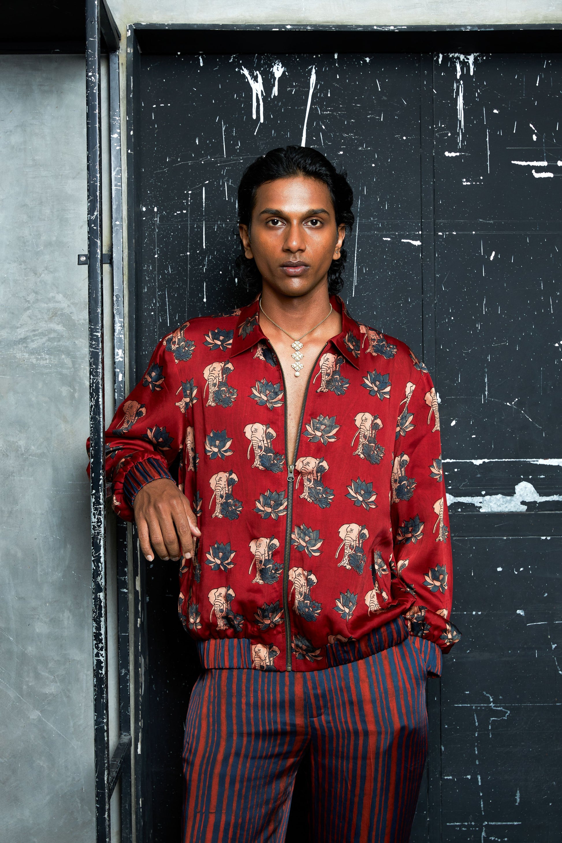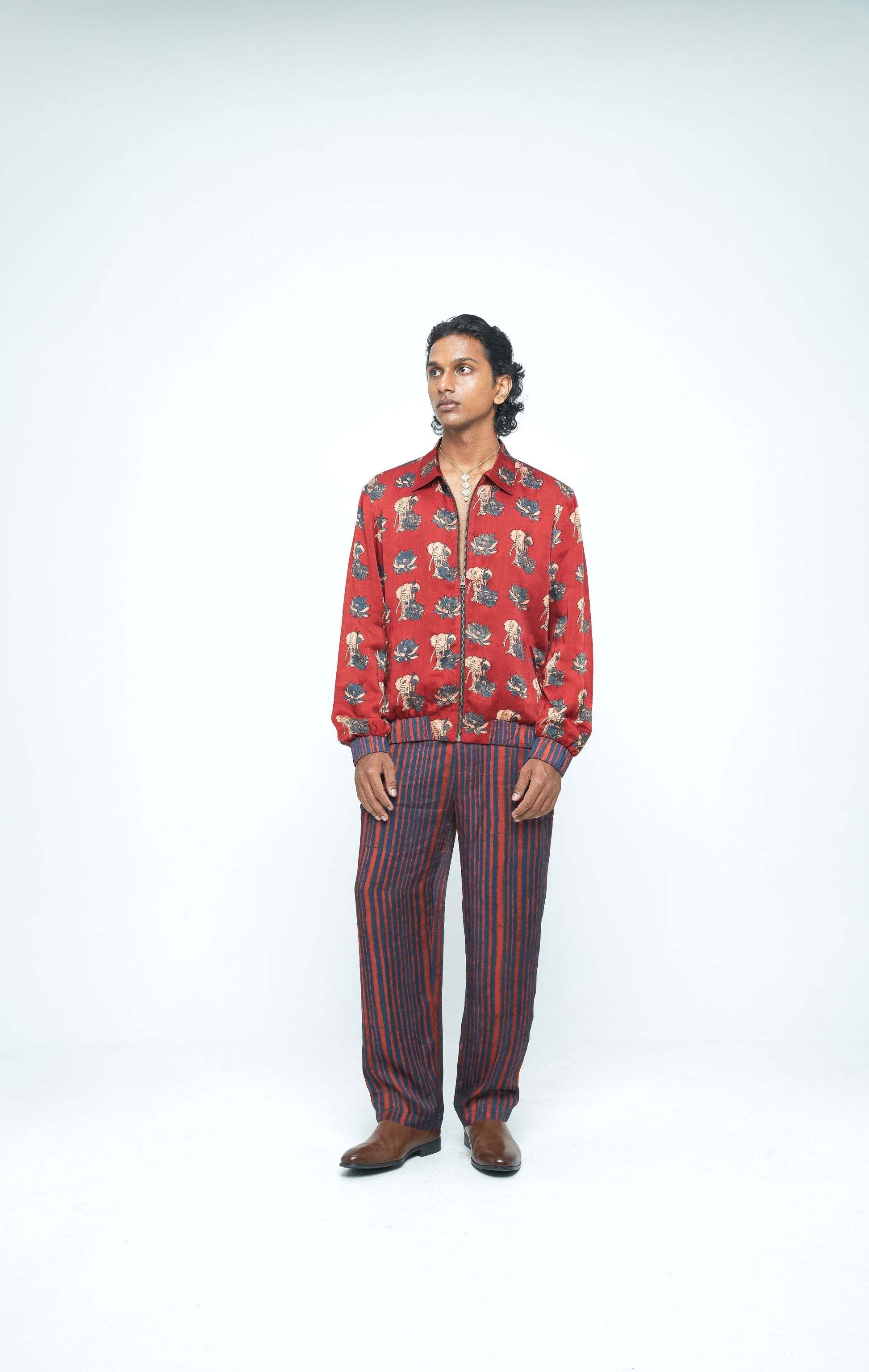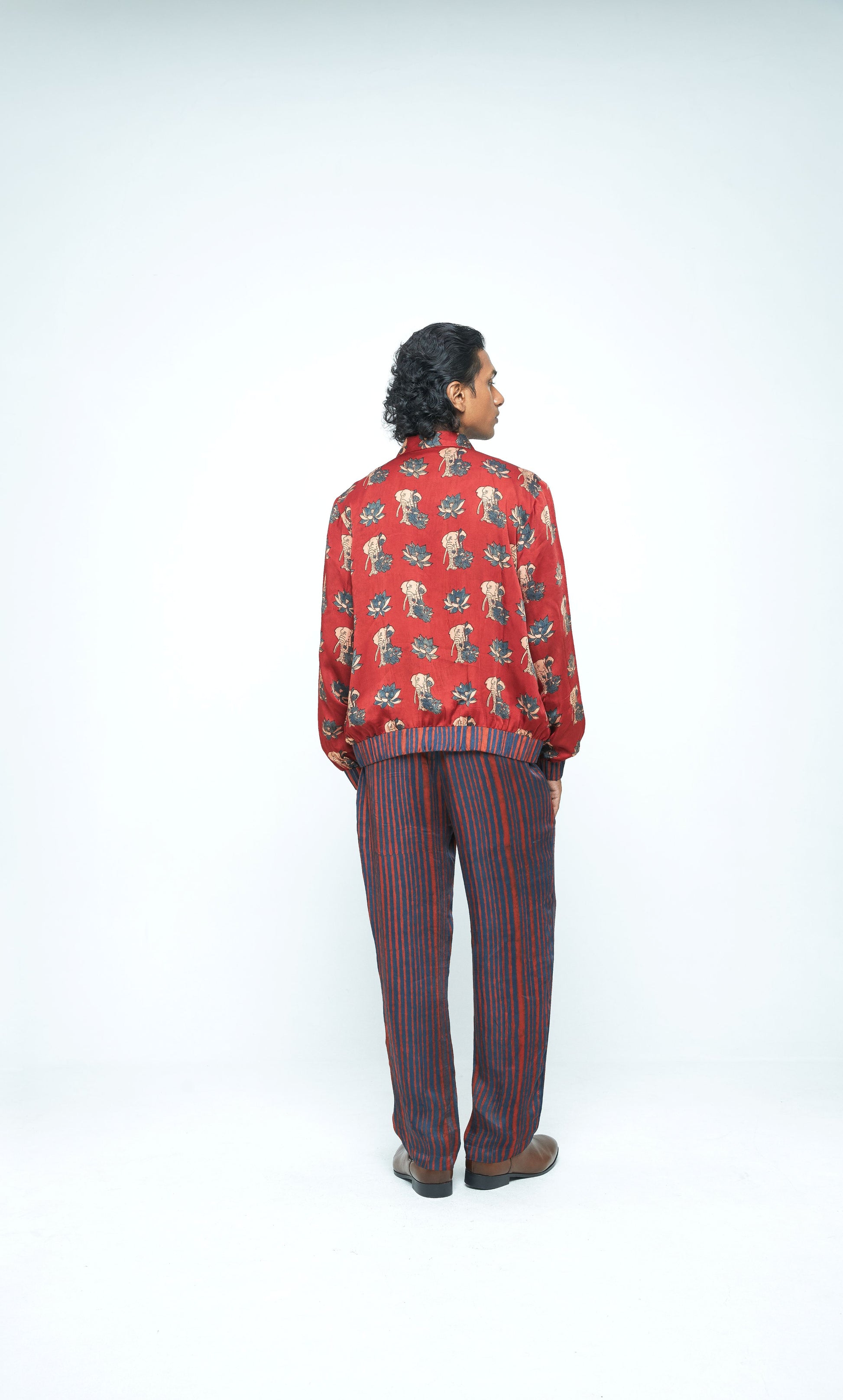 Description: A statement bomber jacket featuring the Gentle Giant print, colour-blocked with Rustic Stripes for contrast. Designed with a structured collar and a relaxed fit, iit brings bold print and clean tailoring together — an elevated layer for evenings, travel, and effortless occasion dressing.