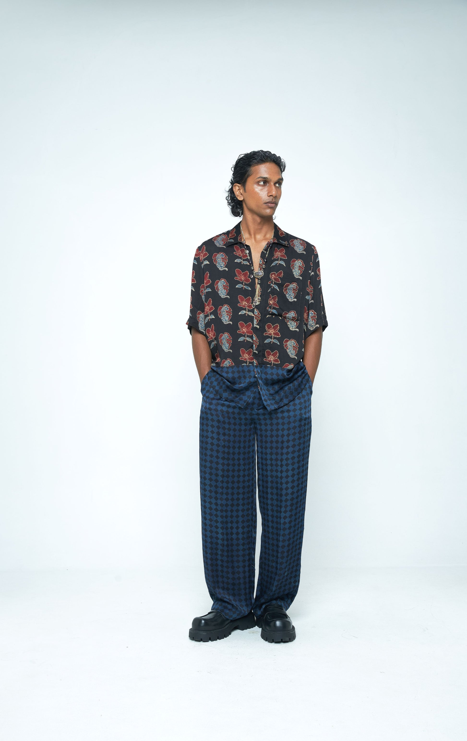 Description: Full-length trousers featuring the Shadow Checks print. Designed with double pleats at the waist and a tapered leg, they strike the perfect balance between structure and ease — a refined staple for luxe occasions.