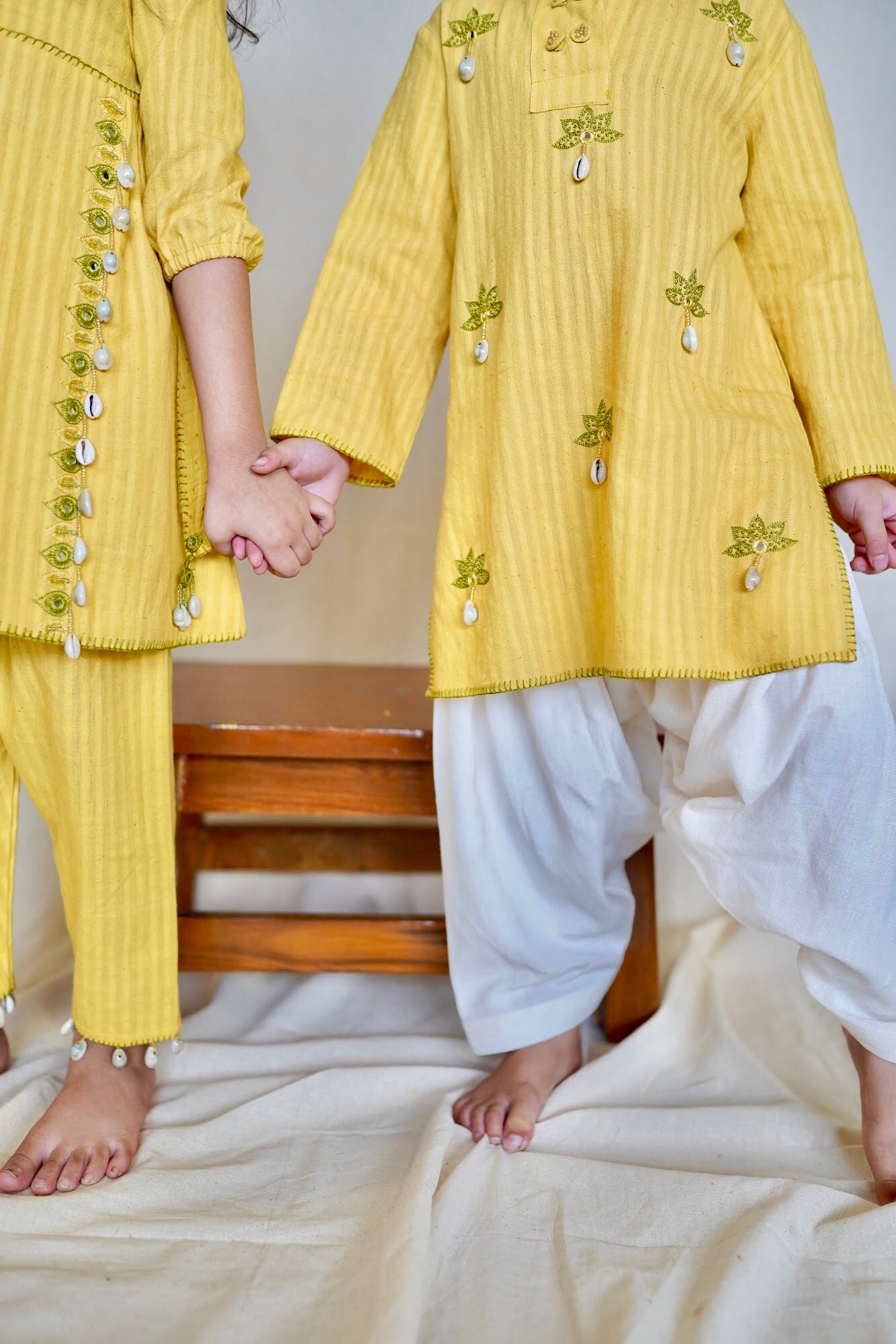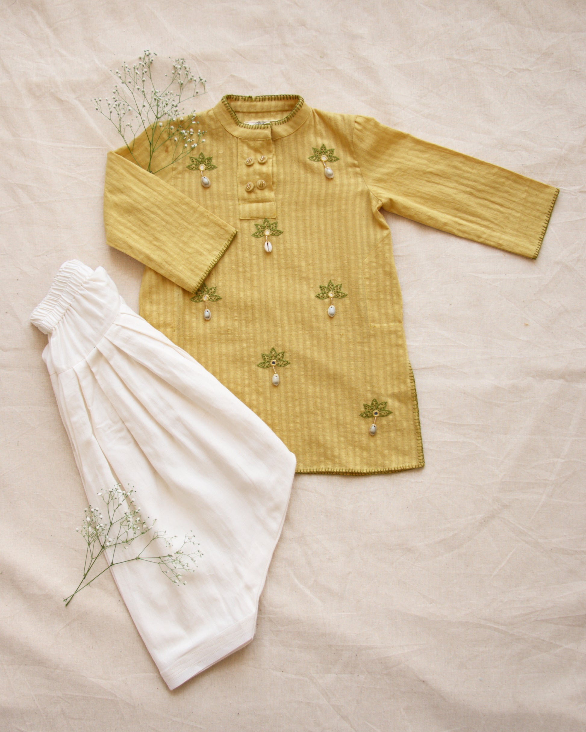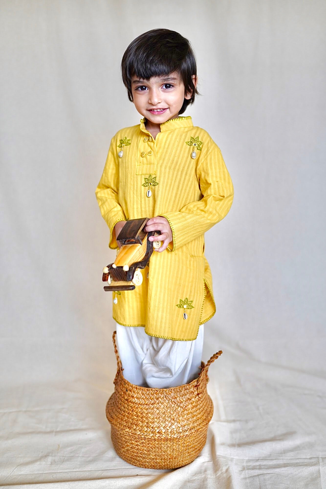 Yellow Jasmin Kurta set for your little one with hand embroidery and hand tucked shells in front and dhoti salwar to finish the look.
