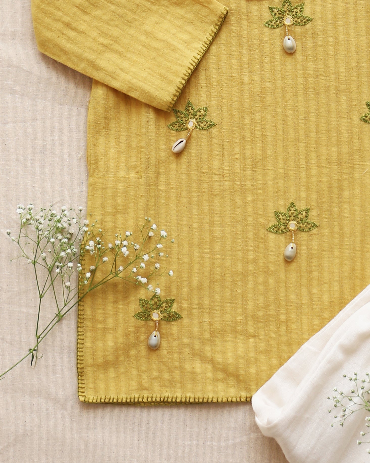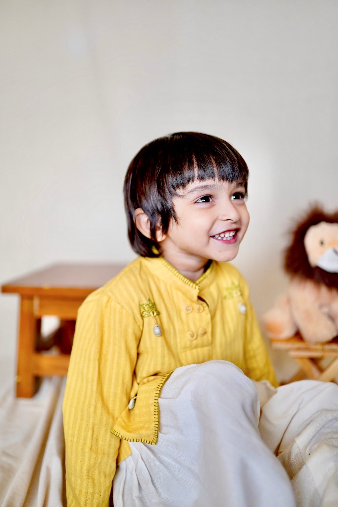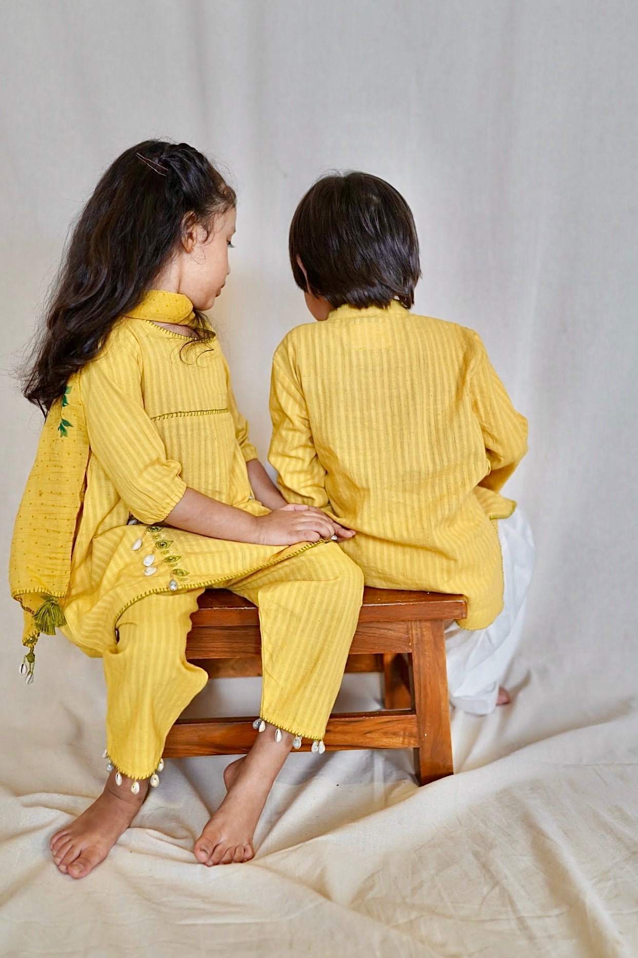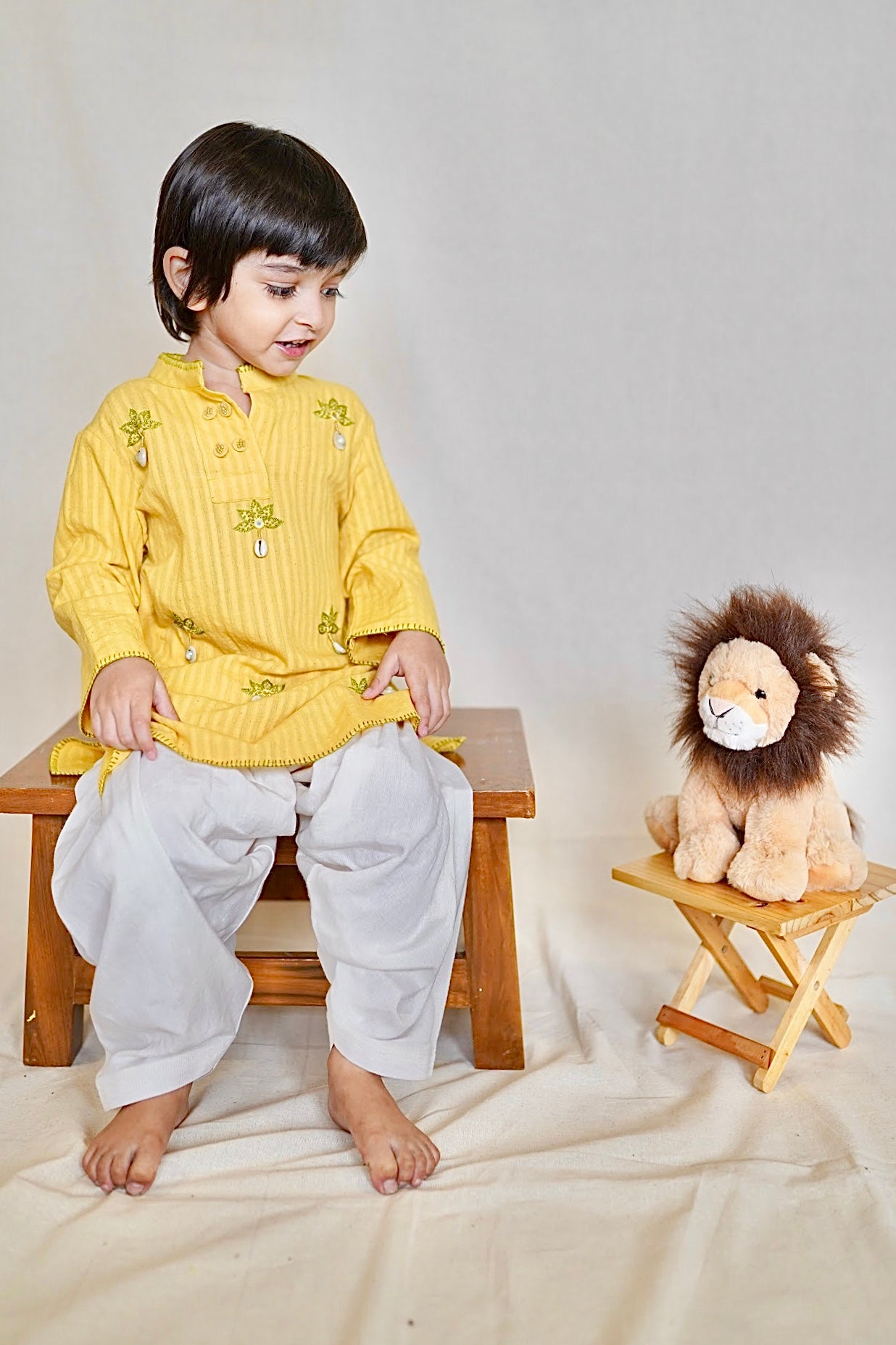 Yellow Jasmin Kurta set for your little one with hand embroidery and hand tucked shells in front and dhoti salwar to finish the look.