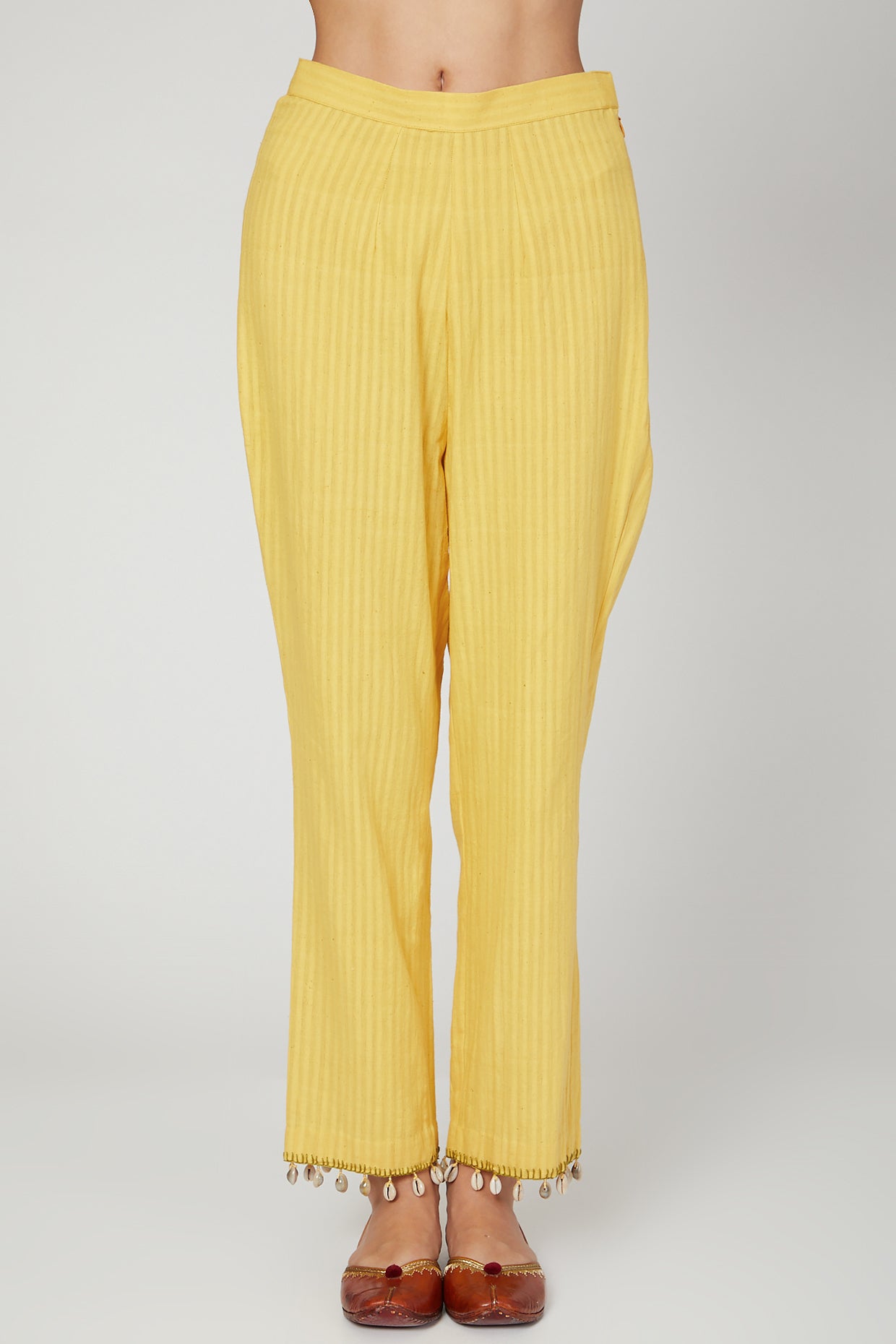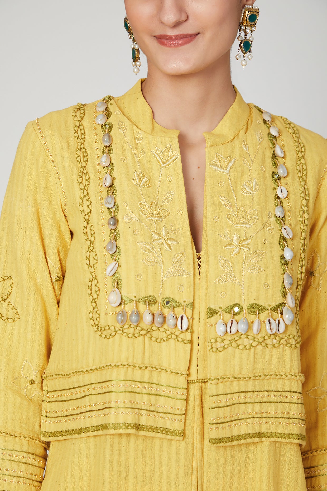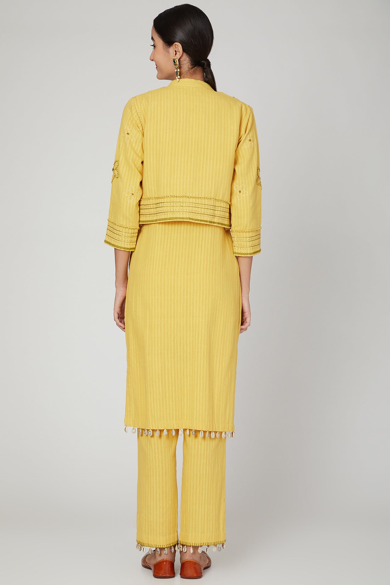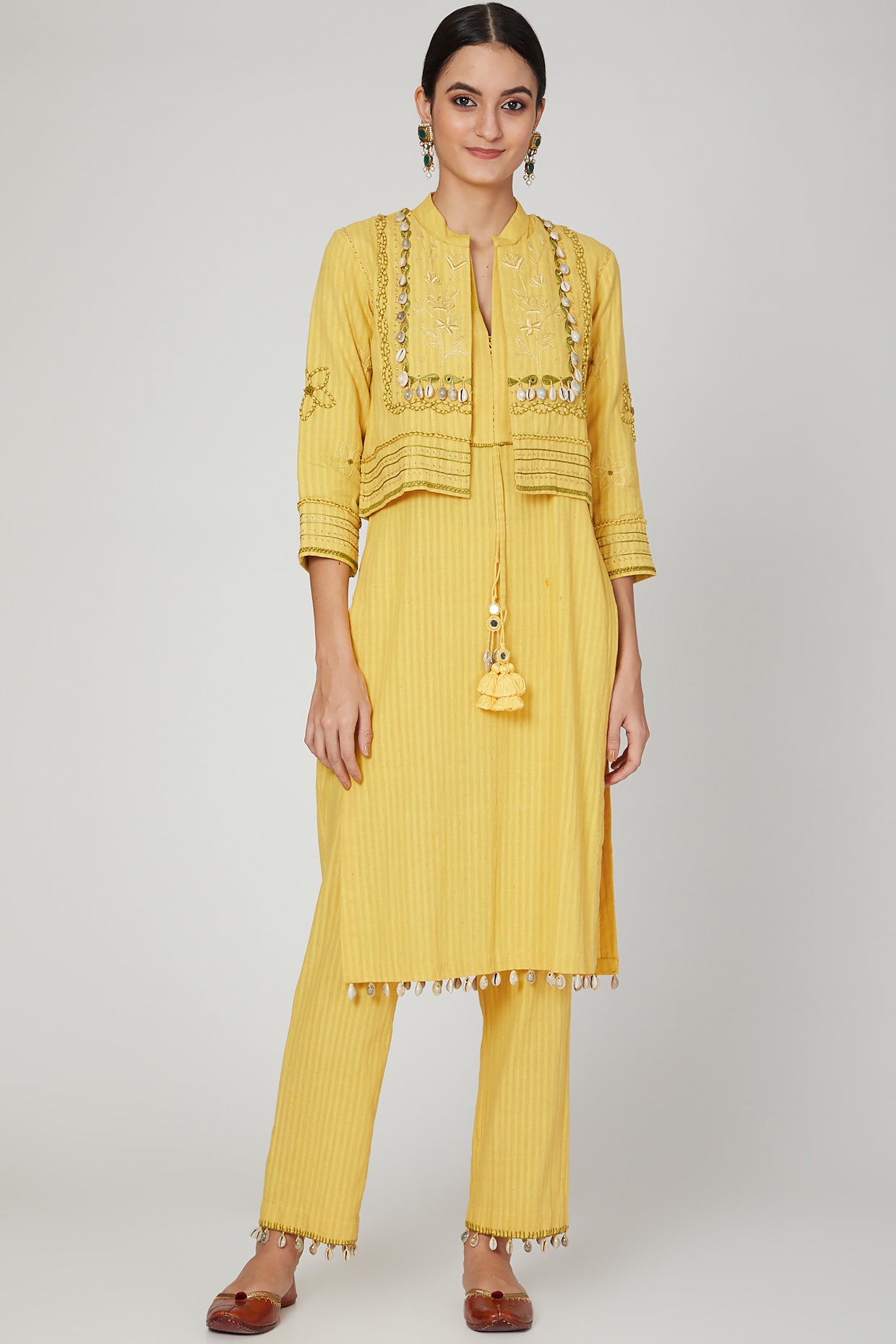 Featuring turmeric separates paired together as a three-piece set, hand-embroidered boho jacket, kurta with tassel and detailed straight fit pants.