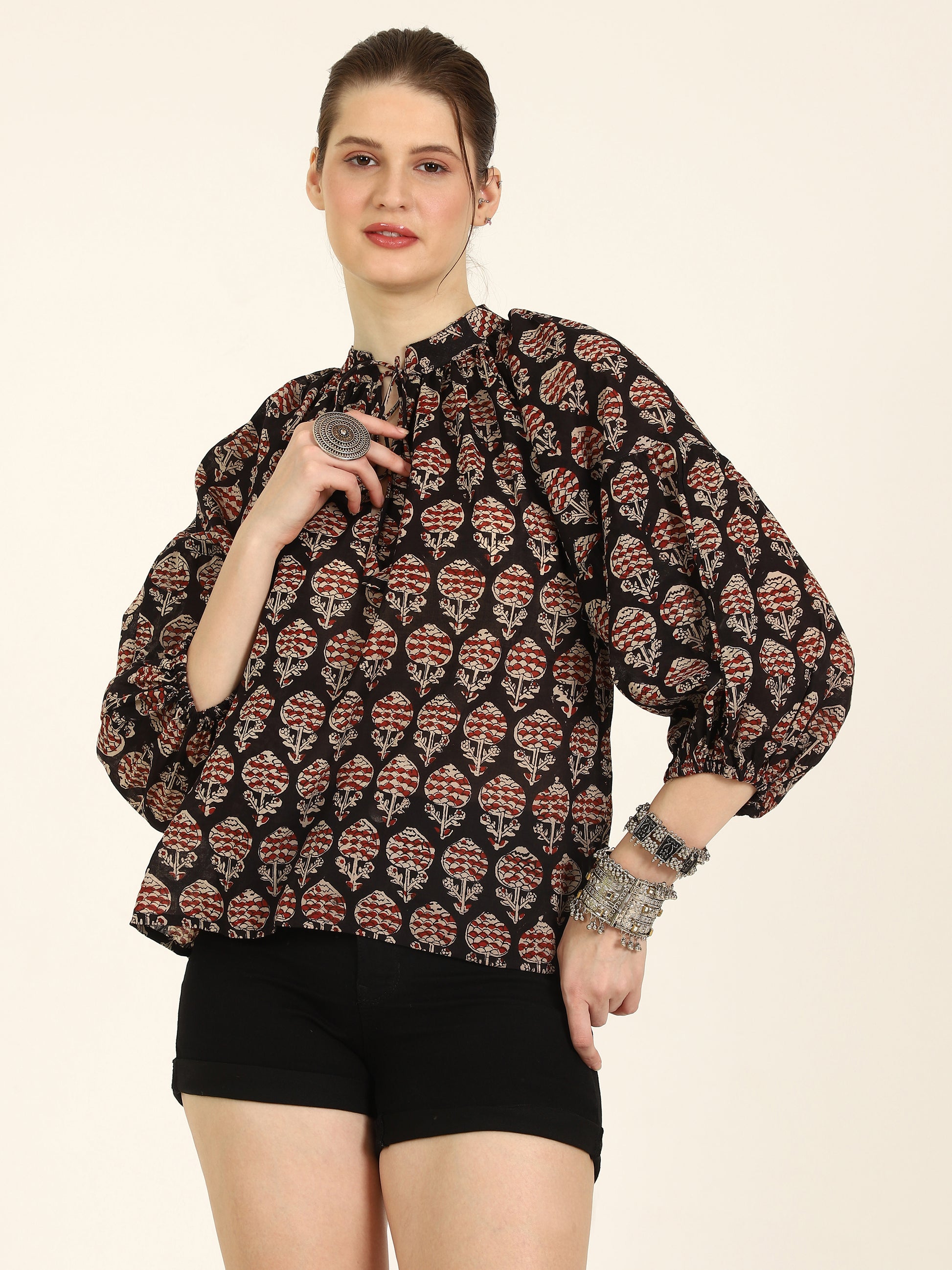 A comfortable billowing blouse; adjustable gathering at the neckline; balloon sleeves making it part of the current trends